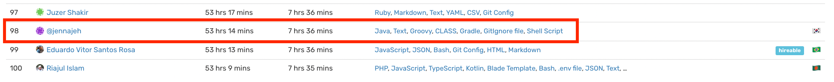 +그리고 wakaTime 이라는, 개발자가 사용하고 있는 IDE 툴을 통해 단순 프로그래밍 개발 시간을 측정해주는 사이트가 있다. 어제 동기들과 함께 들어가서 순위를 구경하다가 98위에 내 이름이 있다는 소식이..! 뭔가 이번 주는 프로젝트 주간이라 시간이 좀 더 나올 것 같은데 이번 주말에 확인해 봐야겠다. 그리고 1위는 104시간 이던데 어떻게 살아계시는지 궁금하다. 그냥 켜놓는 다고만 해서 측정되는 것이 아니라 정말 순수 타이핑 시간을 계산하는 거라고 하던데.... 아무쪼록 1위 분은 건강하시길..ㅎㅎㅎ