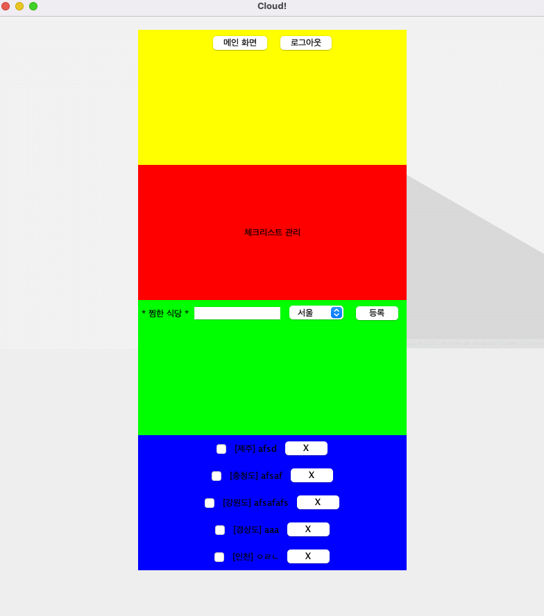 그리고 오늘 오전에 코딩도장에 와서 빈 화면부터 한 메서드씩 복사해가며 진행 흐름을 따라가는 과정을 거쳤는데 결국 해결되지 못하고 울상으로 있자 우리 기수 똑똑이들 우지님과 보니가 와서 도와줬다. (감사합니다 ㅠㅠ) 일단 내 패널들이 하나씩 쌓이기 위해서는 BorderLayout으로 패널들을 연결-연결하는 방식으로 계속 이어줘야 했다. 계속 실패하다가 다시 또 갈아엎고 처음부터 작성하니까 패널이 이어지는 문제는 해결되었는데 다른 문제가 생겼다. 등록 버튼을 눌렀을 때 리스트가 패널에 보이긴 하는데, 프로그램을 종료했다가 다시 켜면 보이지 않고 뭔가를 등록해야 그 이전 데이터들이 나타났다. 체크리스트가 추가되는 패널이 생성될 때 나타나지 않는 것이다.