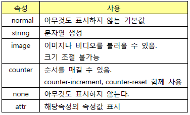 아래의 표는 content 를 쓸 때, 대표적으로 사용되는 속성들이다.