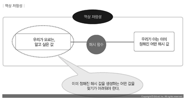 역상 저항성은 해시 값이 주어졌을 때, 그 해시 값을 생성하는 입력값을 알아내기가 불가능하다는 특성이다. 즉, 주어진 해시 값이 H가 있다면, 그 해시 값을 생성하는 (H=Hash(M)) M 을 계산하기가 어려워야 한다.