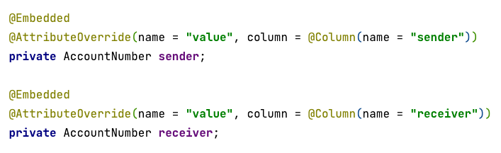 이러한 경우 컬럼명을 재정의 해주지 않고 위 처럼 바로 사용하면 Repeated column in mapping for entity 라는 중복 에러가 발생한다. @Embedded 를 사용하는 경우 객체의 이름이 아닌 해당 객체 안에 작성된 필드의 이름을 컬럼으로 사용하기 때문이다.