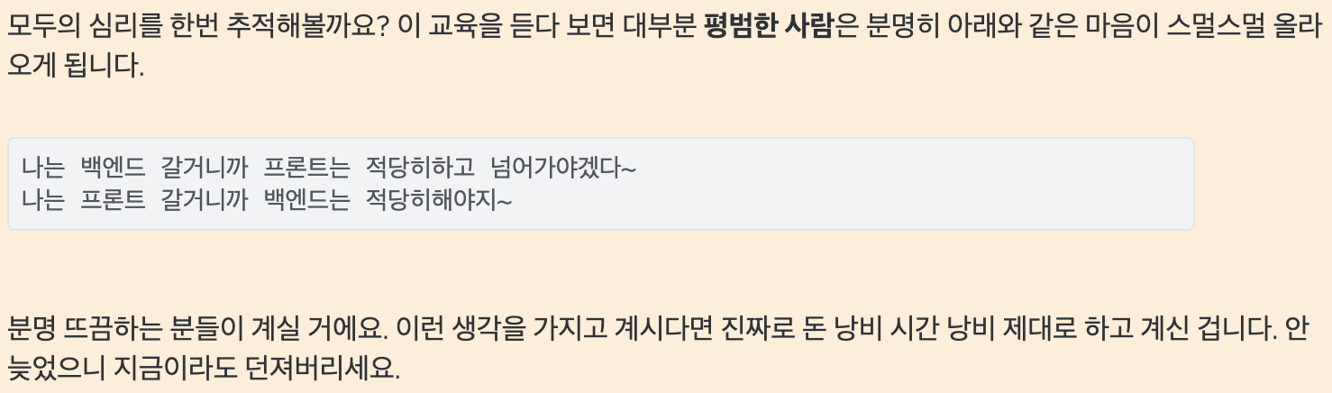์ ๋ง ๋ง์ด ๋ฐ์ฑํ๋ ๊ณ๊ธฐ๊ฐ ๋๋ค. '๋๋ ๋ฐฑ์๋ ๊ฐ ๊ฑฐ๋๊น ํ๋ก ํธ๋ ์ ๋นํ ํ๋ฉด ๋ผ~ ์ด ์ ๋๊น์ง๋ ๋ชฐ๋ผ๋ ๋ผ!'๋ผ๋ ๋ง์ ๋ด๊ฐ ์