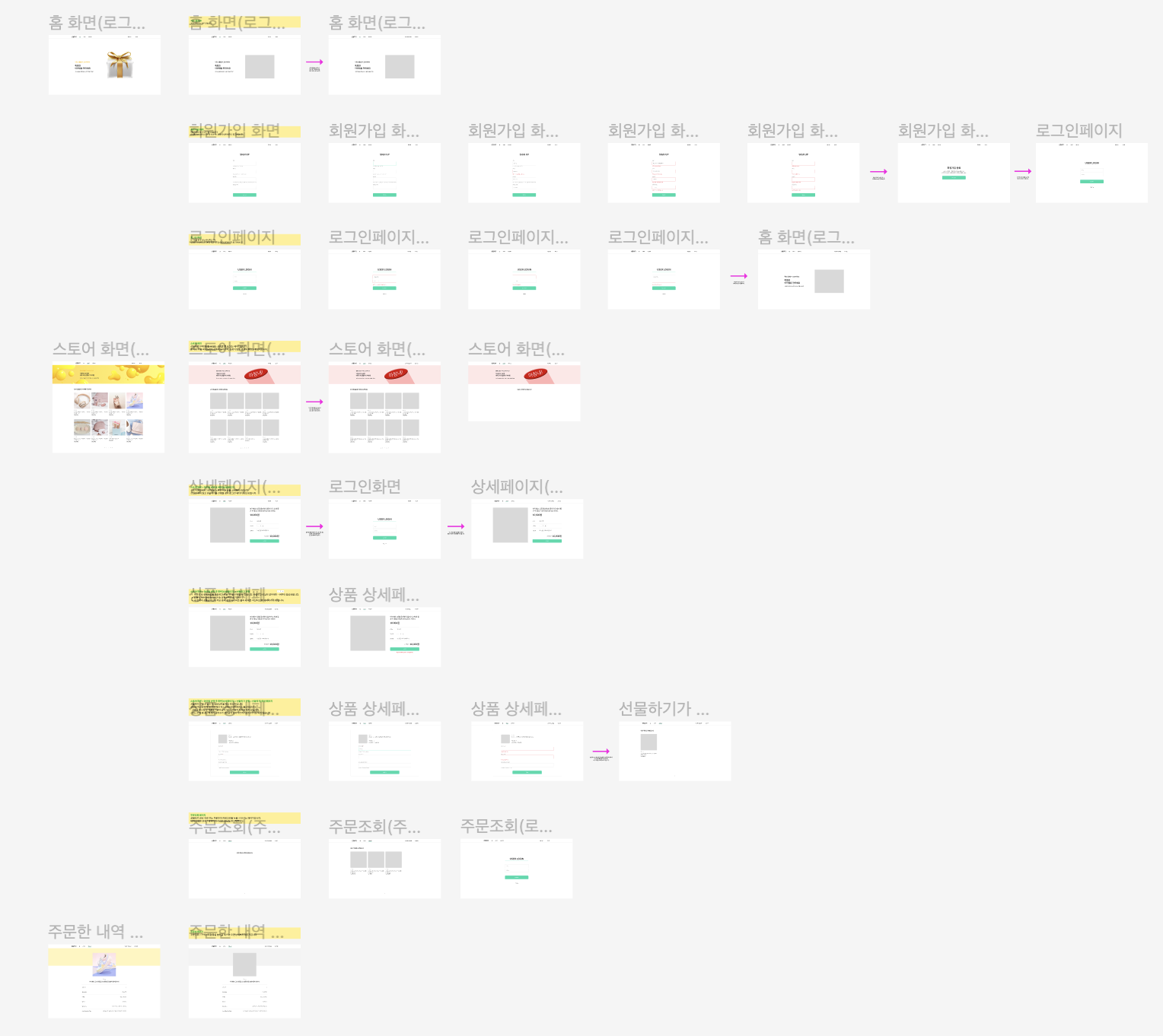 이번 레벨테스트 주간은 '특정 상품을 선택해 구입해서 친구에게 선물하기' 의 기능이 포함되어 있는 웹사이트를 만드는 것이 과제이다. 일명 마카오 기프트. 선물하기 기능만 포함되어 있으면 되고 도메인과 디자인은 자유롭게 하면 될 것 같다. 아래 사진은 기초 요구사항이 담긴 피그마이다.