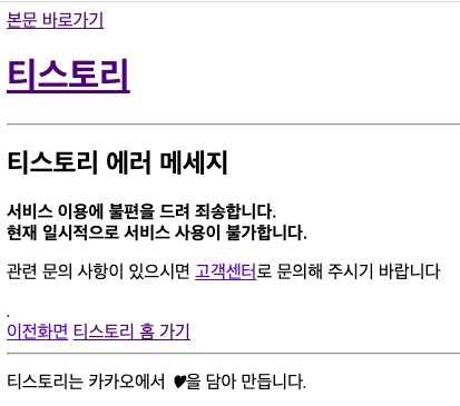 요즘 몸에서 왜 이렇게 아프다고 아우성인지 모르겠다. 1년 내내 감기 따위도 걸리지 않던 나였는데 요 근래 3년간 아주 몸이 쓰레기가 된 것 같다. 건강 관리도 프로답게 해야하는데 운동이라도 해야 하나 정말!? 운동은 진짜 싫은데!?!? 어쨌든, 오늘도 아침부터 위염으로 난리가 나서 응급실 가서 수액 맞고 집으로 돌아와 하루종일 약 먹고 누워있었다. 그래서 카톡이 되지 않는 것도 방금 안 사실..^^ 이 와중에 티스토리 에러 화면 ui 가 웃겨서 캡쳐했다.