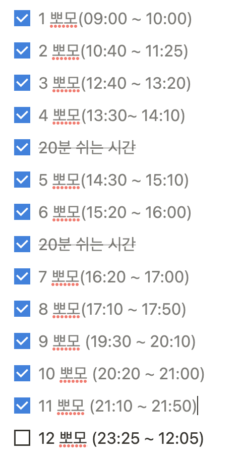 그리고 오늘! 목표는 12 뽀모였는데 현재 11 뽀모까지는 달성했고, 퇴근하고 나서 12 뽀모는 현재 진행중이다.
