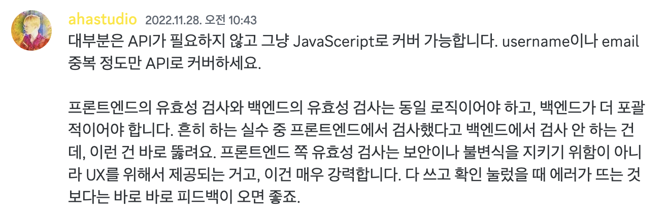 유효성 검사를 위해 백엔드에서 api 를 만들어서 실시간으로 검사하게 하고 그것을 ui 로 그려준다. 지금 하고 있는 테스트 코드 오류들을 해결하고 나면 시도해 보아야겠다.