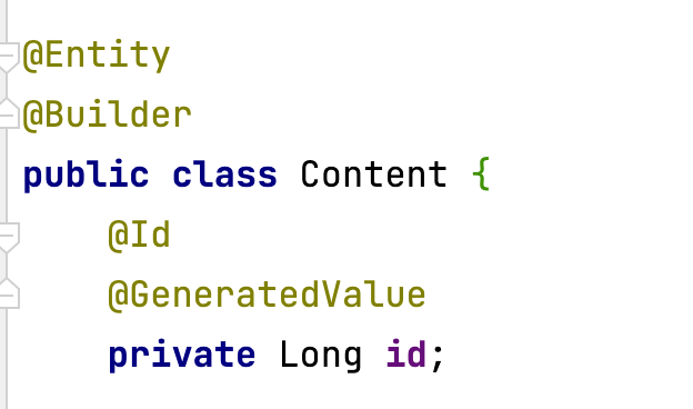다음은 contentRespository 를 작성한 후 model 인 Content 를 만들어주면 된다. Content 를 respository 에 저장하기 위해서는 @Builder 어노테이션을 선언해주어야 한다.